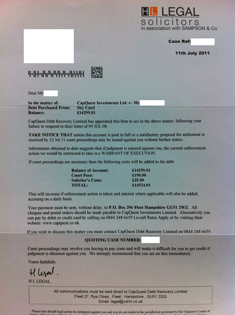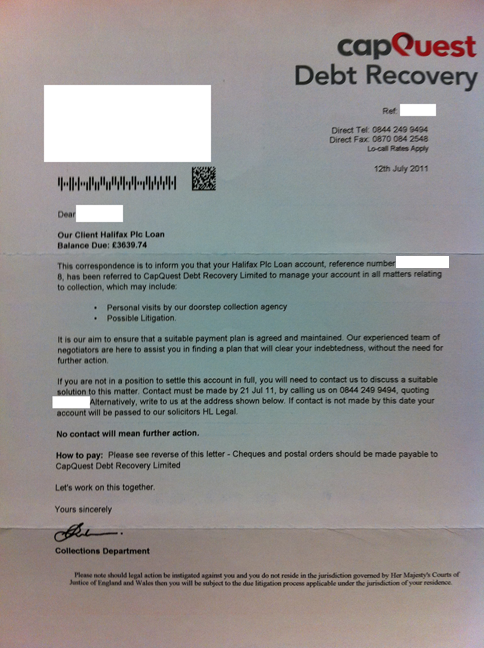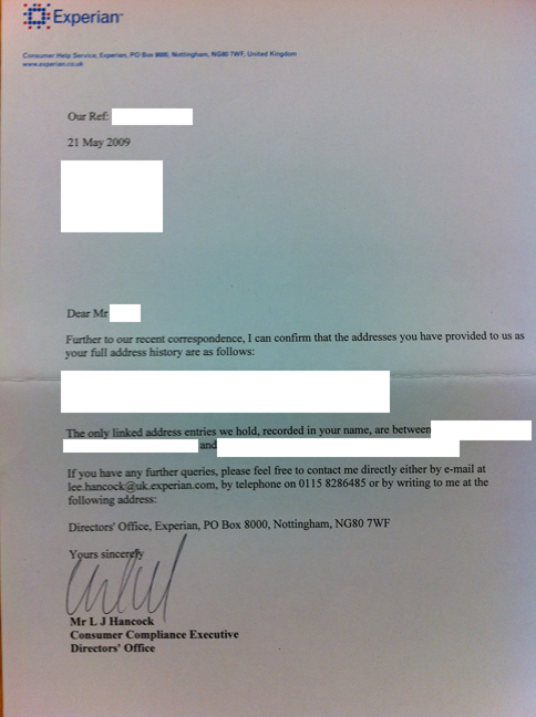 I have been the victim of ID Fraud in the past and the CIFAS Registration plus the notice of correction text on all my credit files should be enough to clarify that for you, however you have a slight problem – I have no connection to you nor to the company that you claim I owe money to – meaning you do not have any right to go and search me! If, for whatever reason, I find out that you have then I’ll have you in court quicker than your feet can touch the ground. I can only presume that these debts are related to the INCORRECT link on my Equifax file, i.e. XXXXXXXXXXXXXXX? If so then tread very carefully, I have so far sued 3 lenders and the credit agencies over this fiasco - for the record, I have never lived at that address. I presume you were unaware of my previous addresses otherwise you’d not have wasted time writing to me would you?