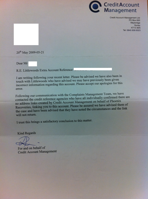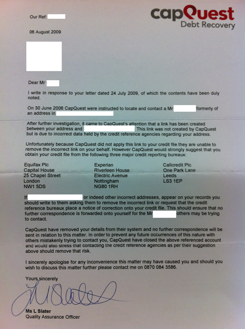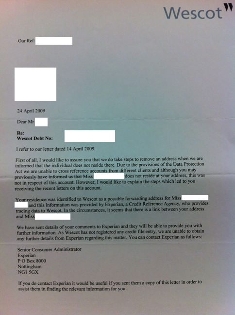Well seems that we're now into year 6 - all the DCA's from the past are trying to make contact again, unfortunately for them - last time I communicated was in 2009 at which point I threatened a charge of £25 per letter which I am now invoking as a result of their inability to deal with a simple request to disassociate my address with the incorrect linked address.