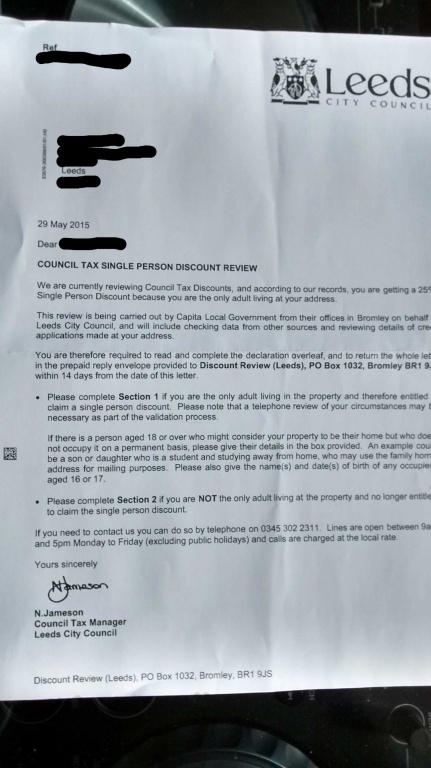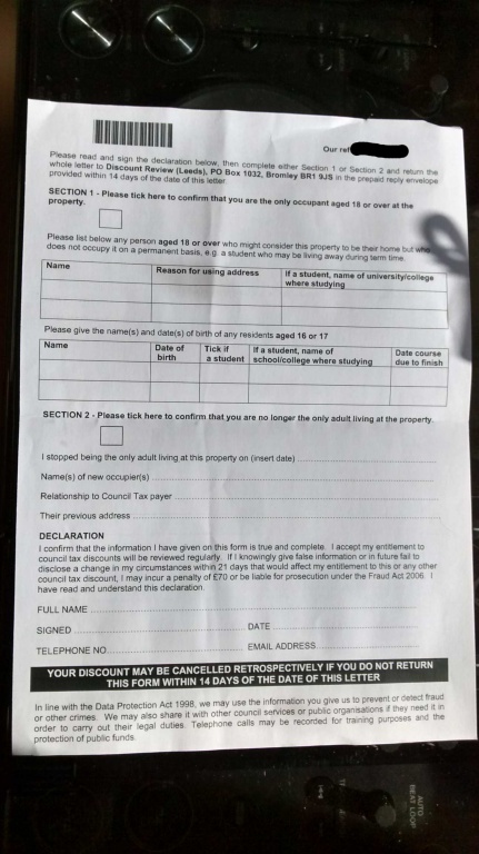 It's a letter demanding that I sign it to declare that I am the sole occupier of this house (which I am) and consent to let Crapita, the infamous private corporation, store my personal data and cross-check it against credit reference agencies etc. They threaten to take away my council tax single person's 25% discount if I don't return the form within 14 days (OK, I'll just return it then, it doesn't say anything about having to complete it or sign it) and even backdate it. I want to challenge this and demand that the council tells me where in law it states that one has to sign away one's personal data to third parties without consent, where in law it states that the burden of proof is on the householder to prove that they aren't making a fraudulent claim instead of the council proving that they are, and where in law it states that the 25% single person's discount is a privilege, not a right. I don't have any problem with the council taking measures to check whether I really am the sole occupier of the house, that much is fine, but I object to letting my data get into the hands of Crapita, of all organisations. For one thing, Crapita also runs the TV Licensing contract and I get hounded enough by them for the temerity of choosing not to have a TV licence when I have no TV.