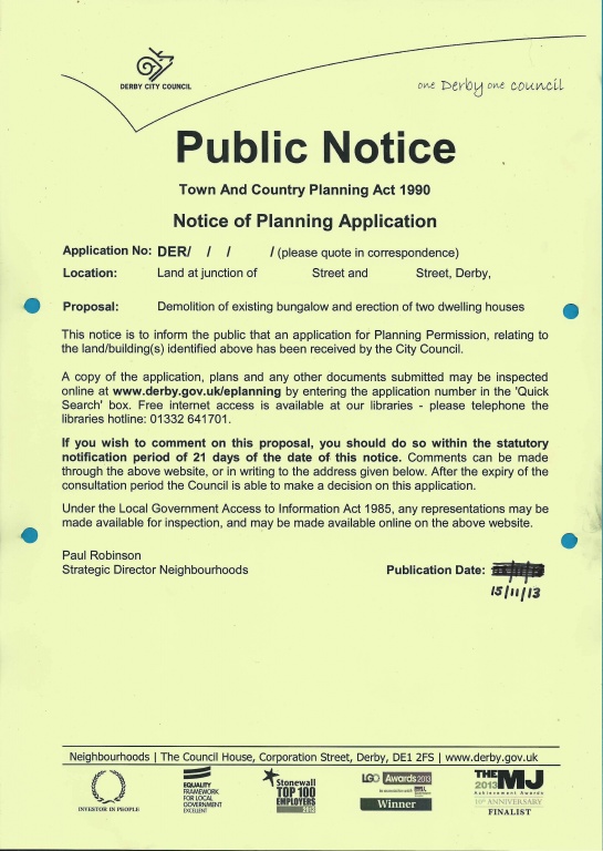 Last week, I found a notice on the lamp post outside our property informing of intention to demolish and erect 2 dwellings on the land.