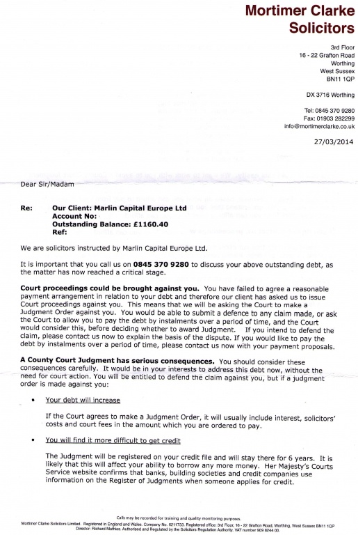 I've seen some nasty threat-o-grams in my time, but to mention that some employers use credit checks and employment prospects could be affected is sinking to a new low even for this lot.Originally posted by GlennBaker View PostHi Niddy, Letter received today from Mortimer Clarke Solicitors (same address as Marlin):"I fear all we have done is to awaken a sleeping giant and fill him with a terrible resolve."
