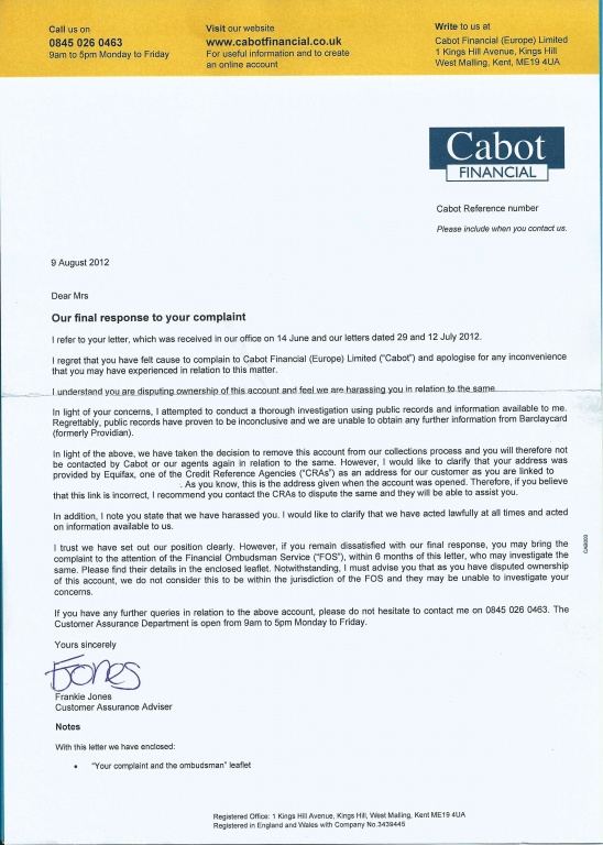 Re: Unknown Debt from Cabot Finance