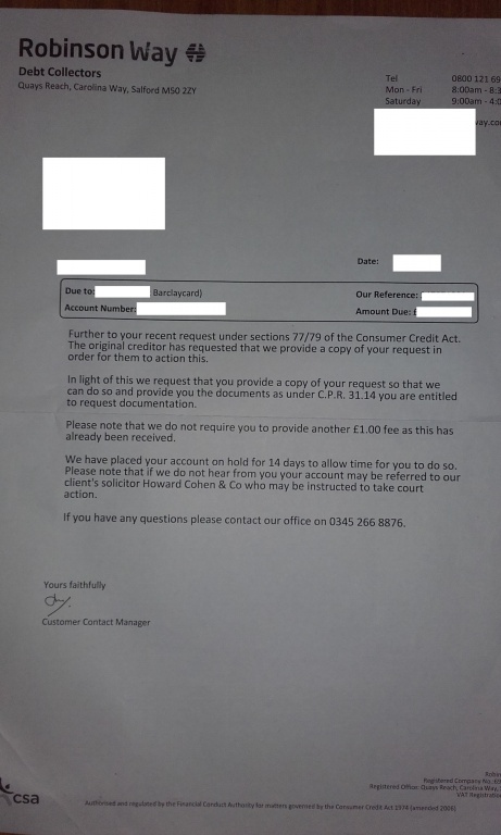 last couple of weeks ive been having a few letters back and forth with robinson way .i requested a cca from them they then sent me a letter saying i did not send the £1 postal order see first letter ,then i had another saying i had paid money off the balance ? which i did not it was the £1 postal order for the cca ,then i get this today think this is the 2nd or 3rd one ive had .i still have not recieved the CCA .this is my egg account