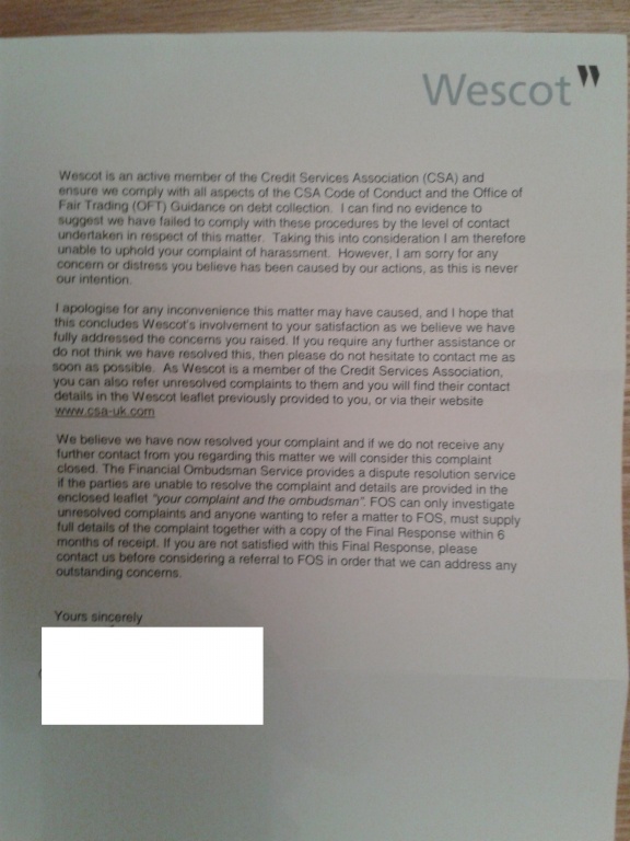 after sending off the account in dispute letter to wescot ,i had a letter back saying they were looking in to the matter ,i have just had a reply from my SAR request which i sent off to see if i could claim back ppi on an old loan ,all i got back was credit card statements and my credit card application form ,so wescot have sent this letter saying that the matter of UE is now closed and i should contact them to set up a payment plan .
