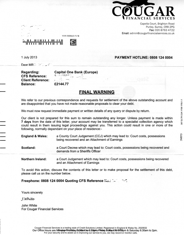 No cca from cougar received, just last threat letter. Its this I dont know what to do as its been weeks now since cca request. One liner letter sent to HBOS regarding LTS... not sar request.