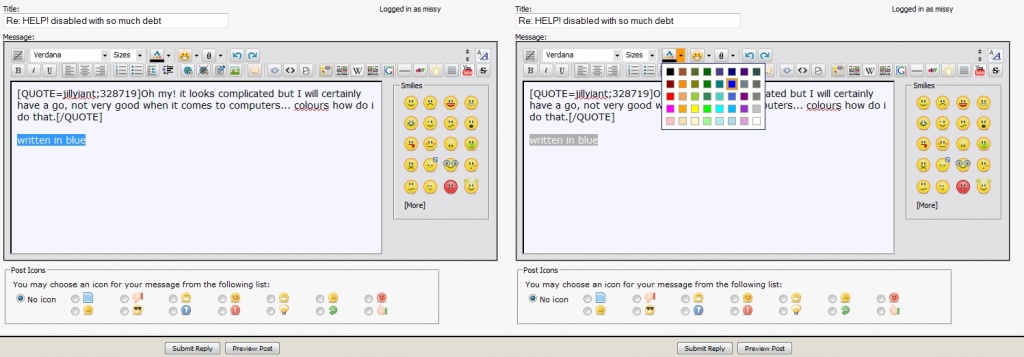 This may help -- > User Guide - How to use/change the Font Colour - allaboutFORUMSOriginally posted by jillyiant View PostOh my! it looks complicated but I will certainly have a go, not very good when it comes to computers... colours how do i do that."If wishes were horses, beggars would ride"