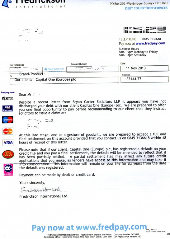 25/09/13 letter received from fredrickson ..letter before action (is being considered) as an after thought on the letter.
