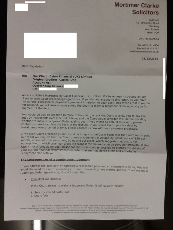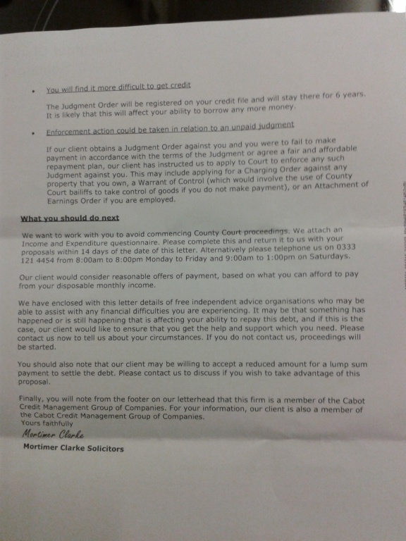 have started this new thread because the other thread is mixed up ,have done the CCA posted up the reply [POST 14] on the link ,which niddy says was UE [POST 15] on link ,sent a missing pt letter and havent heard from them since 2011.so today i recieved this from cabot .