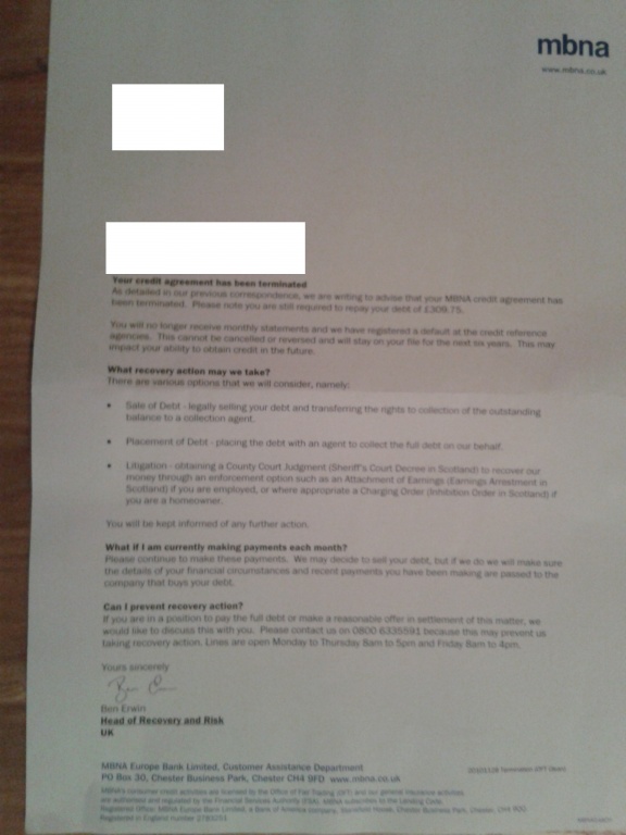 Thanks for that, it may explain why I cannot find a default or tremination notice for my MBNA account. Just been looking through old stuff and thought I had been lax in my filing!