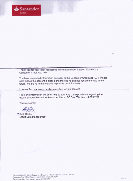 I purchased a fridge from currys but the finance was with santander. I wrote to santander asking for the loan agreement details and they replied saying: The account is closed and there is no balance required or due and we are therefore not obliged to provude thi information however we can confirm that insurance was applied to the account.