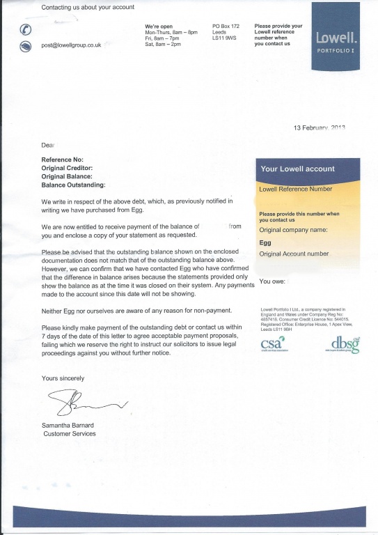 Re: Egg, Lowells, Barclaycard help..
