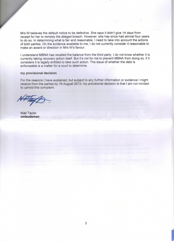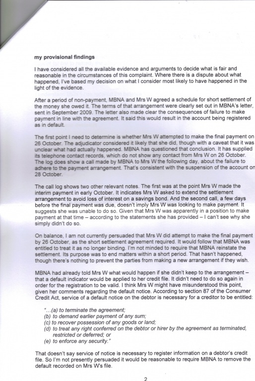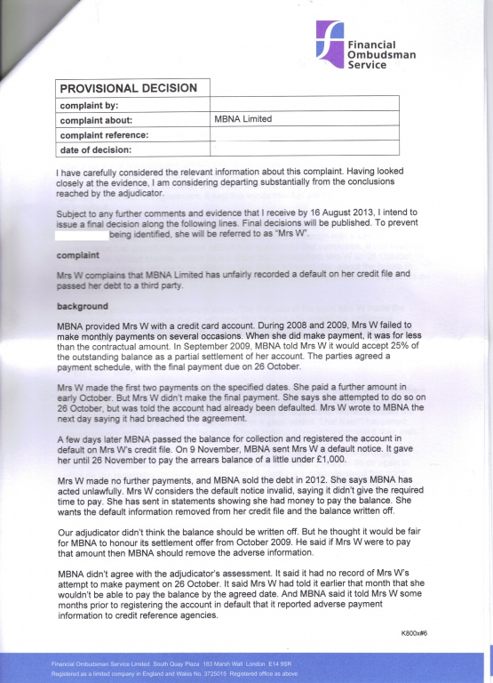 5. A few days later MBNA passed account for collection and registered the account in default on 30/10/2009 - Correct, didn't issue a default notice. Just advising this is what they would do in a letter doesn't mean anything unless they issue a vlaid DN. FOS seem to be somewhat confused and once again are letting financials breach statuary law.