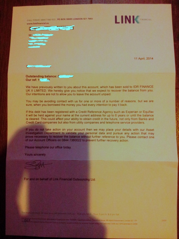 Hello, the last payment was in july 2013. I've had various letters from barclaycard, mercers, resolvecall and now IDR finance. I had a couple of home visits from resolvecall last Christmas, but no more since. I've attached the letter. Thanks