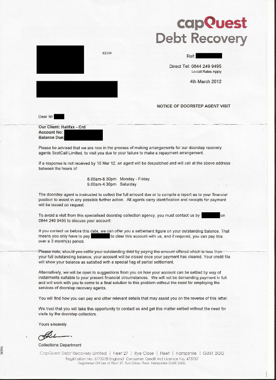 4th Mar 2012 - letter from capquest, sending doorstep agent unless money paid
