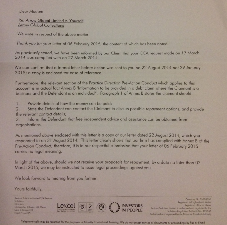 Hello Mrs D! Sorry.....the letter was yesterday's, 5/2/15. The last letter I had from Restons is dated 22/8/14, which I uploaded in #625.