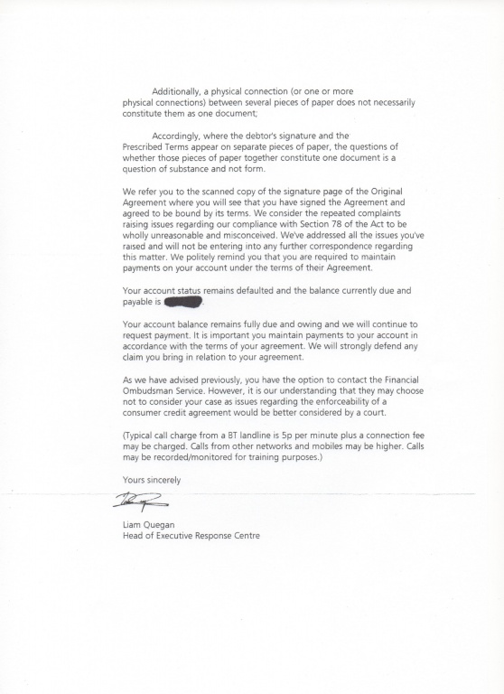 15/09.letter from wetcloths, they have contacted Cap 1 who advised that they provided the docs in Feb and have issued their final demand in March,Therefore the debt is enforcable.