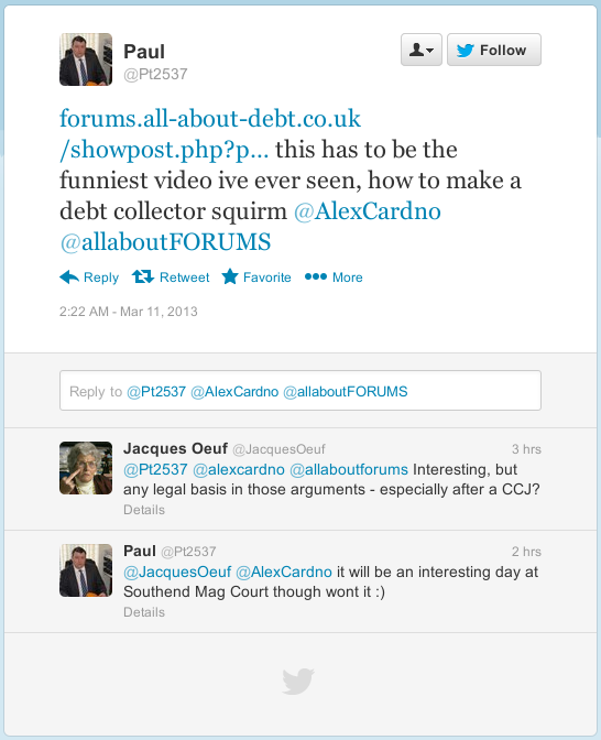 I hold the blokes chances as slim, however, and this is what the DCA's have to realize, is that when you start pushing peoples backs up against the wall, making threats, getting CCJ,s charging orders etc, then people are going to start fighting back. Sooner or later these companies are going to come up against some real smart cookies (you only have to look at this site!), and they are going to get bitten in the behind big time.